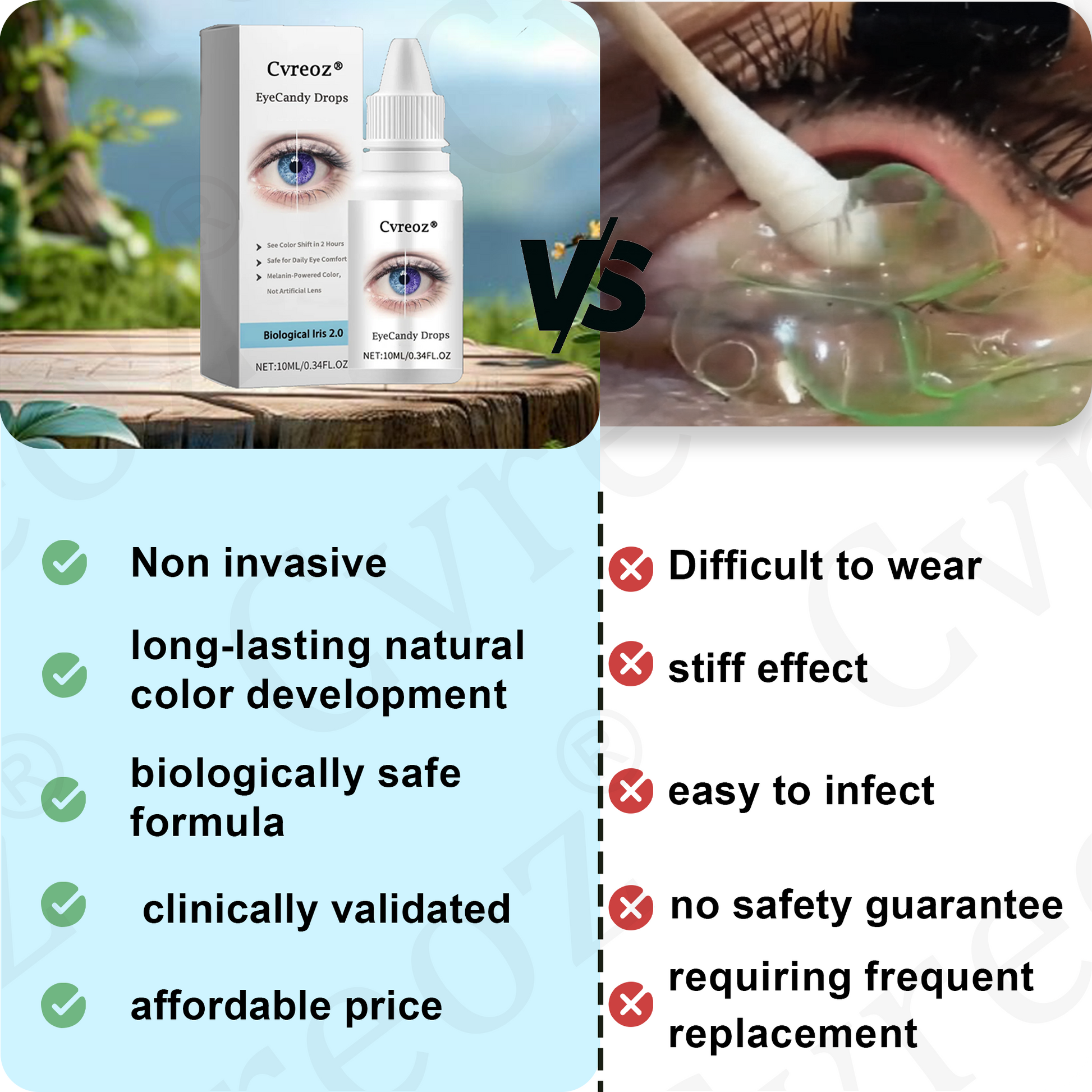 Cvreoz® EyeCandy Drops are a revolutionary innovation that will change the world of eye care! When you apply these drops, you'll be amazed at how the color of the eye drops subtly changes to match your unique eye color, creating a mesmerizing visual effect. It is made with high quality, hypoallergenic ingredients to ensure it is gentle and safe for all users. They are perfect for people who want to wear contact lenses, suffer from dry eye or just want to add a creative twist to their daily routine. Experience the perfect blend of fashion and function with Cvreoz® EyeCandy Drops - the future of eye care has arrived and is more energized than ever!
